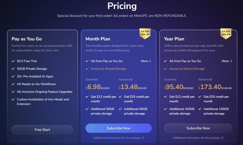 MimicPC supports both “Pay As You Go” usage and subscription plans. You pay only for what you use, with GPU/hardware options tailored to your project’s needs.